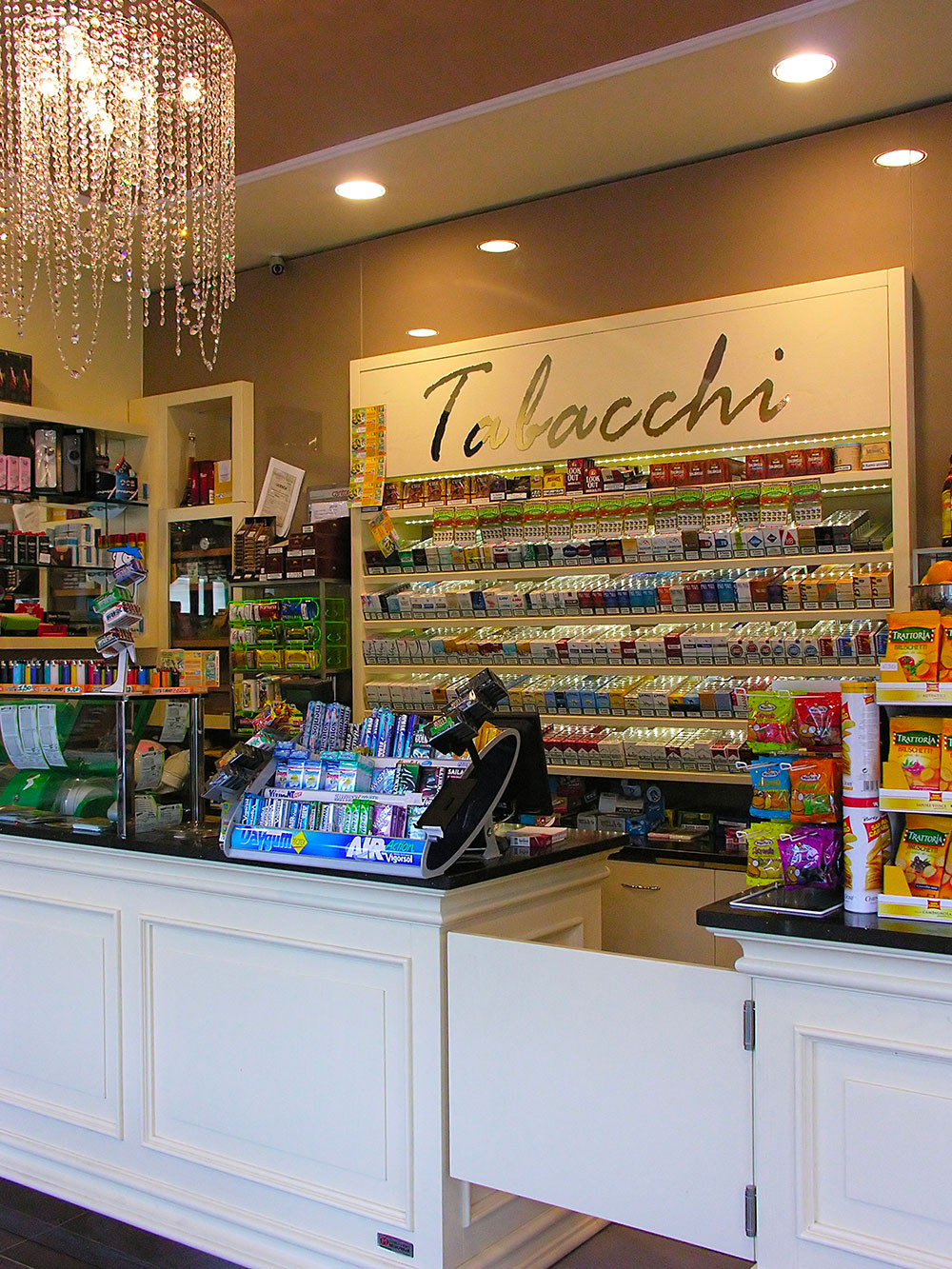 Questo è un locale dallo stile classico ma l’uso dell’acciaio lucido e del legno sbiancato rende fresco e moderno l’ambiente. In questo caso viste le ridotte dimensioni del locale i due banchi (tabacchi e caffetteria) sono adiacenti l’uno all’altro e separati solo da un passaggio. Sulla parete di fondo della saletta c’è una gigantografia stampata su vetro raffigurante un motivo floreale.