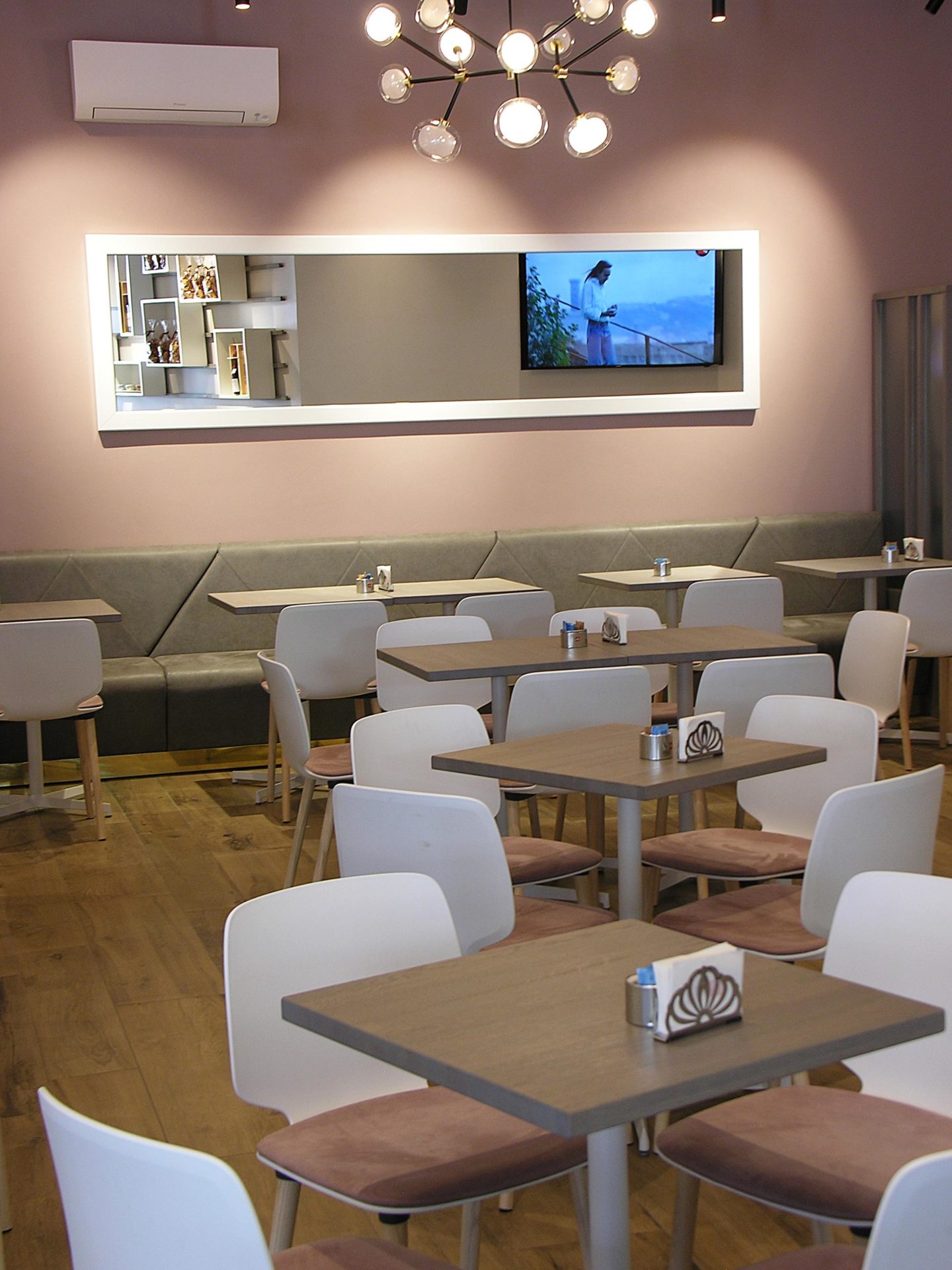 Linee moderne ed essenziali unite all’uso predominante del colore bianco fanno della Pasticceria Milesi un locale moderno ed elegante. Gli inserti in ottone lucido e il rovere tinto grigio contribuiscono a dare eleganza all’ambiente. Di grande impatto anche i due grandi lampadari che richiamano alla mente le atmosfere degli anni ’70.