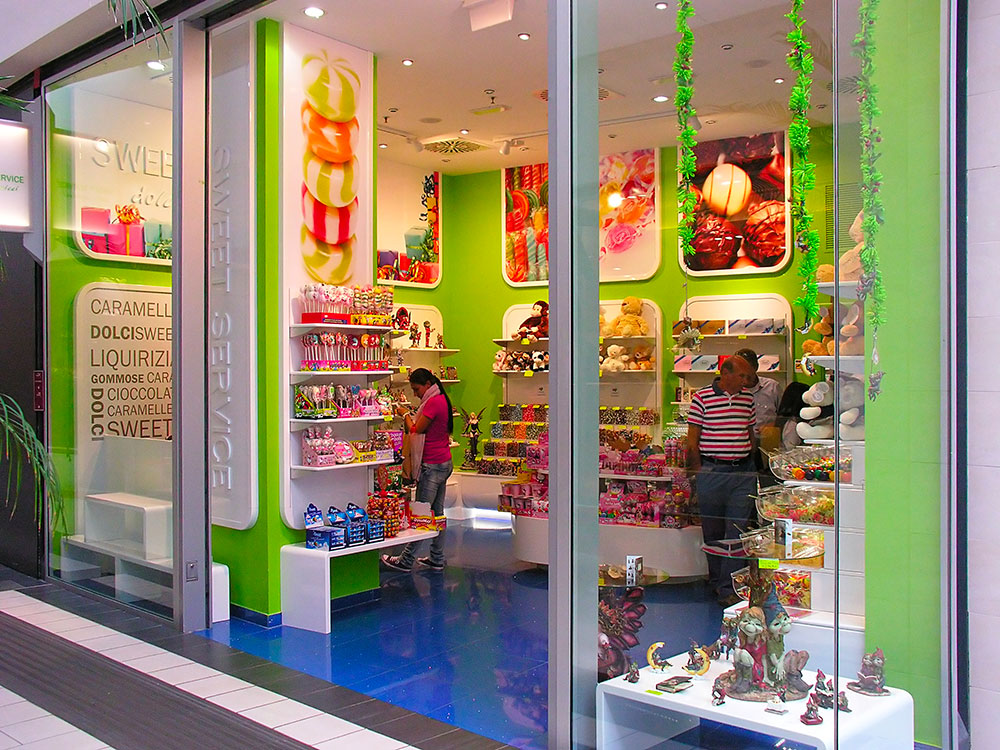 La catena di negozi di caramelle Sweet Service si contraddistingue per la grande ricerca stilistica degli arredi. In questo caso lo stile è marcatamente moderno ma allo stesso tempo giocoso, i mobili laccati bianco lucidi dalla sezione curva ospitano gli espositori delle caramelle realizzati in plexiglass dotati di illuminazione propria. Alle pareti colore verde brillante sono state applicate delle gigantografie di dolciumi. Il pavimento in quarzite blu elettrico contribuisce a creare l’atmosfera “magica” che deve esserci in un negozio di dolciumi.